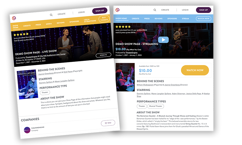 TheaterEngine is the only platform built to showcase and promote both your live shows and your streaming shows. Your audience can sort by location to find your live shows, while your streaming shows are available to everyone, everywhere. Link to your existing ticketing platform or sell tickets directly on TheaterEngine.