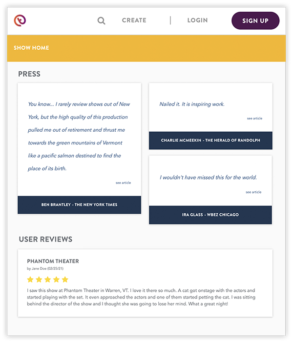 Press Reviews and User Reviews. Did you get a nice feature, or a review in the paper? Show it off! Invite your audience to leave a review directly on your page. TheaterEngine is the only event listing site where you can display your press reviews and user reviews directly on your show page.