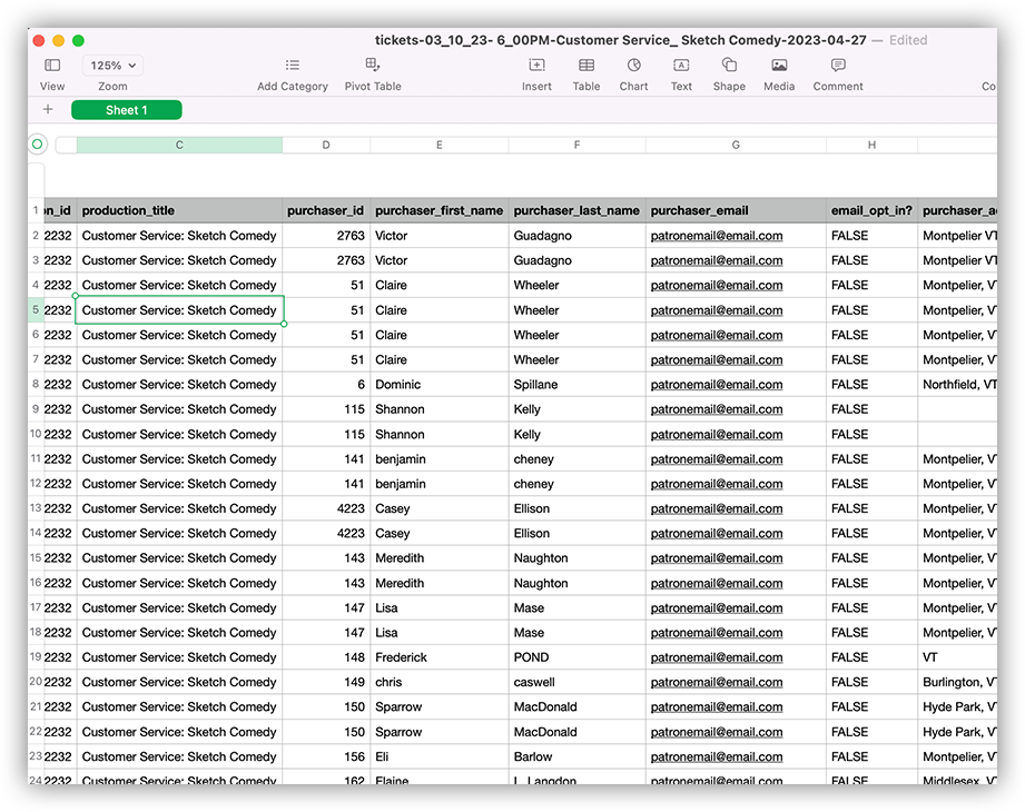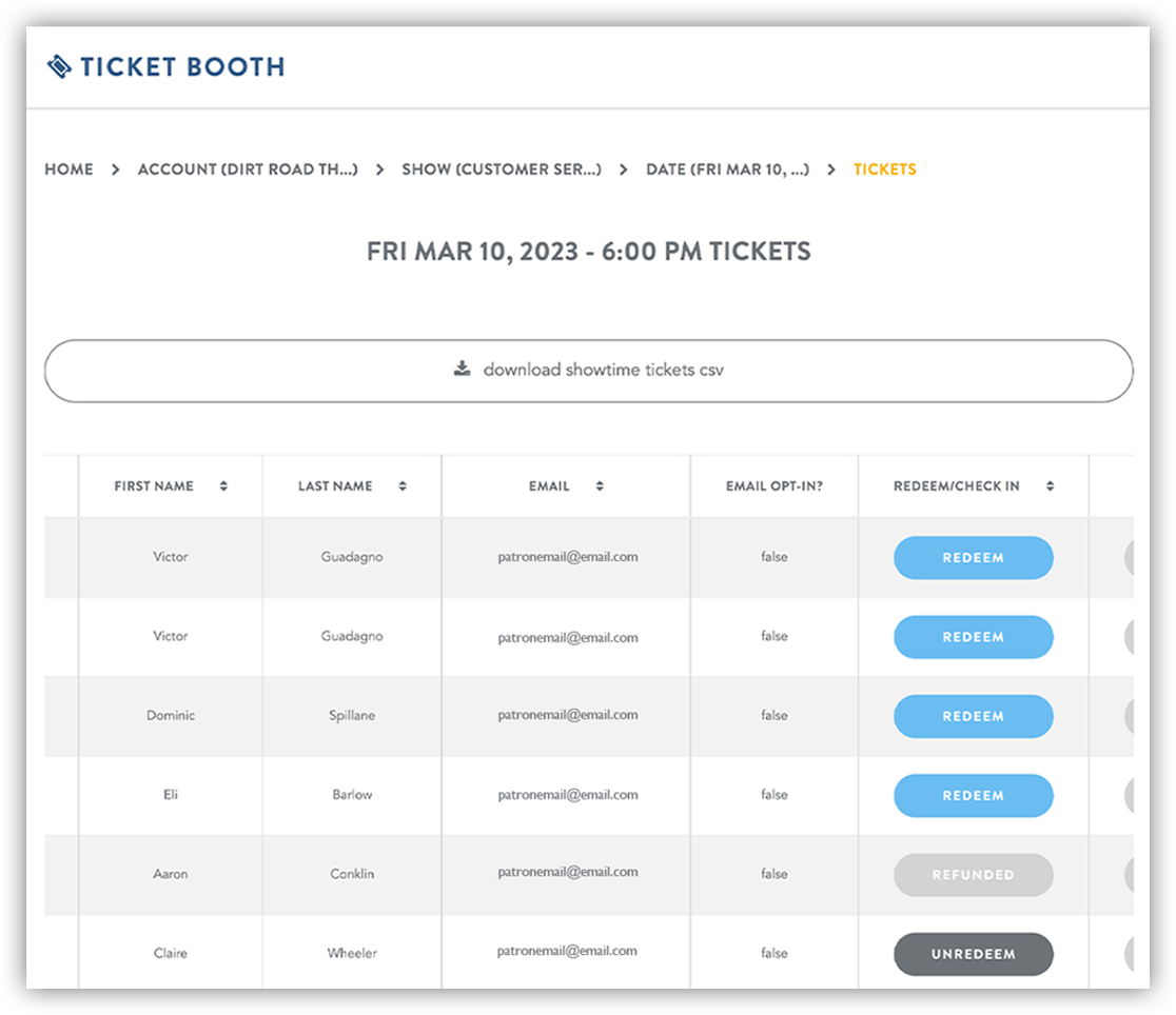 View ticket buyer lists online, or export patron data from the internal box office (ticket booth)
